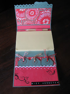 bedel. Draai de twine dubbel om de kaart en bind er dan het flesje en de bedel aan werk het af met een mooie strik en klaar is je twee in een kaart.