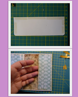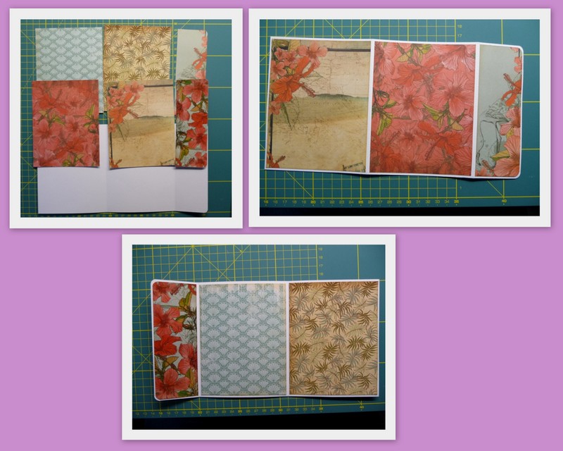 Snij een strook cardstok van 8.5 x 2.5 cm en een stuk designpapier van 8.5 x 2.1cm, beïnkt dan weer alle randen. Snij een plaatje of stempelafdrukje en mat dit op een strookje cardstok, (wederom alle randen beïnkten).Plak dit op het kaartje en werk het geheel af met een bloemetje