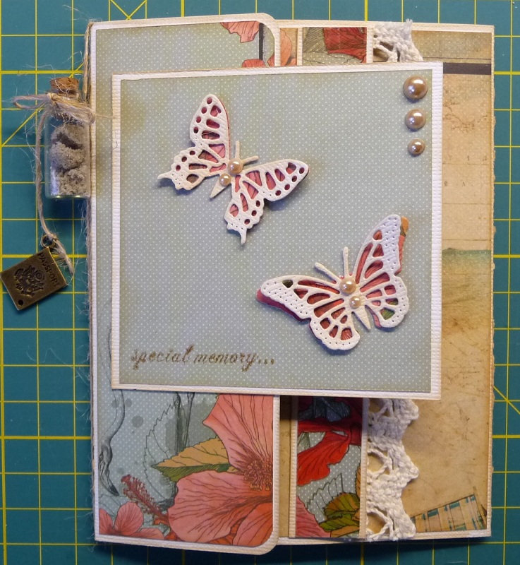 Plak nu nog een uitgestanste butterflys en wings op het middenstuk van de binnenkaart en op het pocket 2 bloemen en een pearl chino.