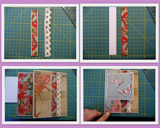 Snij dan een strook cardstock van 13.5 x 2 cm en een stuk designpapier van 13.5 bij 1.6 cm. Beïnkt weer allen randen en plak deze op elkaar. Neem dan een stukje kant van 13.5 cm en plak dit onder het cardstok, zodat er een mooie rand kant zichtbaar blijft. Plak dit alles op de voorkant rechts op de kaart.