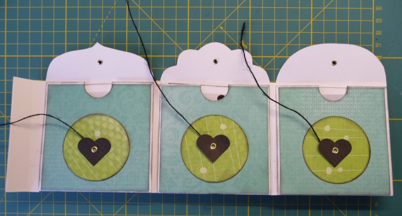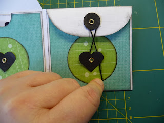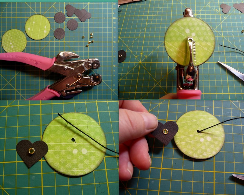 Neem dan het hartje )of grootste rondje en duw daar een eyelet door. Neem je grote rondje en stop daar dan het stukje twine door het gaatje heen. Leg het stukje twine plat (in mijn geval op het groene designpapier en druk dan het hartje met eyelet in het gaatje zodat het stukje twine onder het hartje uitpiept (zie 5de foto) Druk dan de eyelet plat met de crop a dile of eyelet setter. (als je geen eyelets hebt kan je dit eventueel ook met brads doen.) Op foto 7 en 8 zie je hoe de rondjes