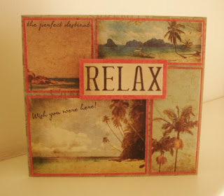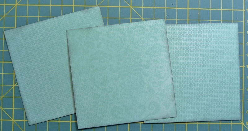 Plak dan op de vierkante vlakken designpapier wat iets kleiner is dan het cardstok (8.5 x 8.5cm) beïnkt daar weer alle randen van.