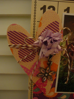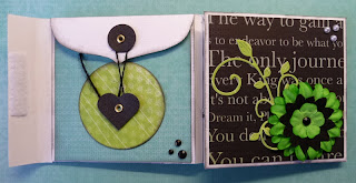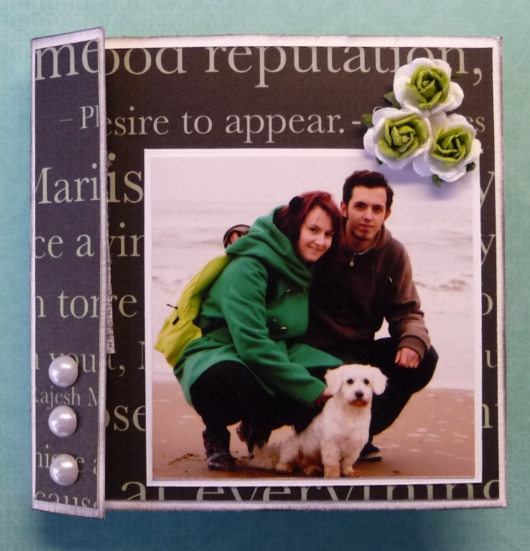 Benodigdheden; 1 vel wit cardstok, designpapier (kaisercraft Chapter One), 6 eyelets, 45cm twine, 3 of 4 kleine foto`s, klein stukje klittenband, inktblokje voor de randen en eventueel ponsen en stansen voor de rondjes en hartjes.