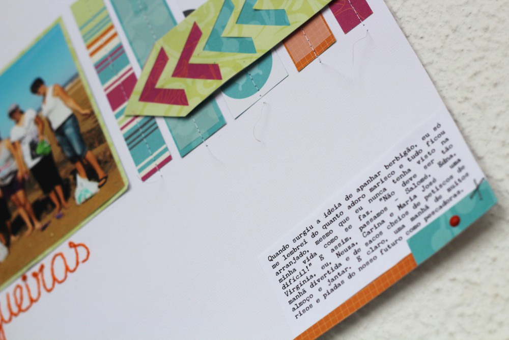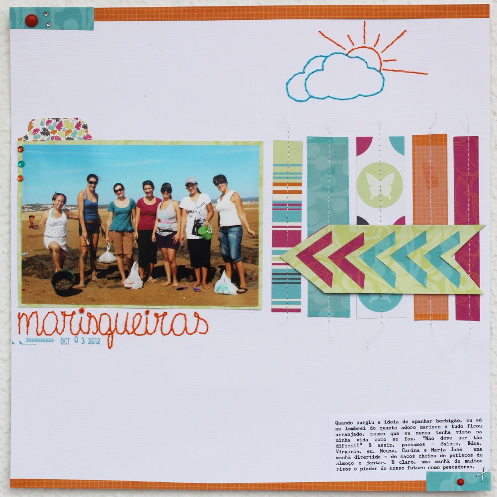 Hello scrappers! Today is my last post here from Scrapplezier! My today's project is totally inspiring on another one from Maggie Holmes. I use my last scraps from Piña Colada collection (Kaisercraft) do a layout about a day when my colleagues and I go to take a kind of shellfish. It's was a funny day and I try to translate it to my page using handstitching to embellish it.