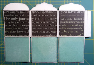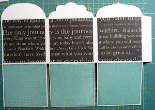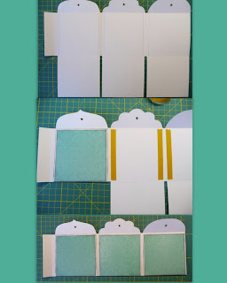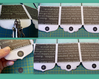 Plak op de potlood streepjes zeer goed klevende dubbelzijdige tape, vouw dan de flapjes dicht op de tape zodat er pockets ontstaan (Op mijn foto`s heb ik nog geen halve rondjes uitgeponst, moet je van te voren wel doen,zie enkele foto`s terug, omdat ik die vergeten was, maar het is makkelijker om ze van tevoren in te ponsen.)