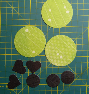 Leg dit even aan de kant en neem dan 2 kleuren design papier. Uit een stuk stans of knip je 3 rondjes van 5.5 cm doorsnede. Uit het andere designpapier snij je 3 of 6 rondjes uit (ik heb zelf nl. 3 hartjes en 3 rondjes genomen) de rondjes zijn doorsnede 1.5 cm en de grote die ik voor de hartjes heb (als je daar rondjes voor wilt 2 cm doorsnede. Beïnkt de randjes van het designpapier.