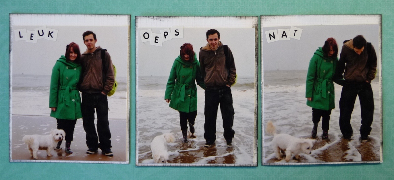 De foto is dubbel gemat en met 3D tape wat verhoogd opgeplakt. De letters zijn uit chipbord gestanst en daarna nog een keer uit groen cardstock, hieroverheen heb ik een laagje glossy accents gedaan. Onder de letters zit een reepje open stof, deze was ecru en die heb ik met groen en bruine distress inkt wat shabby gemaakt.