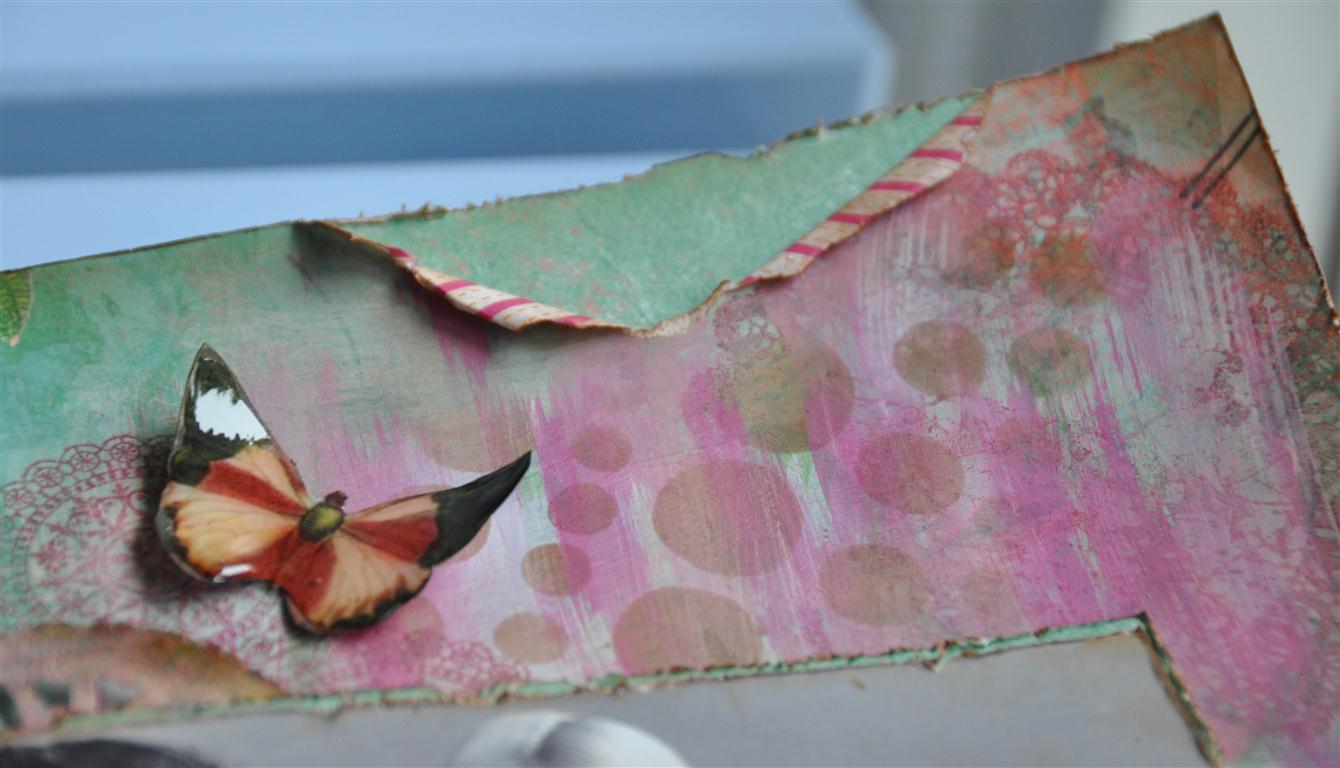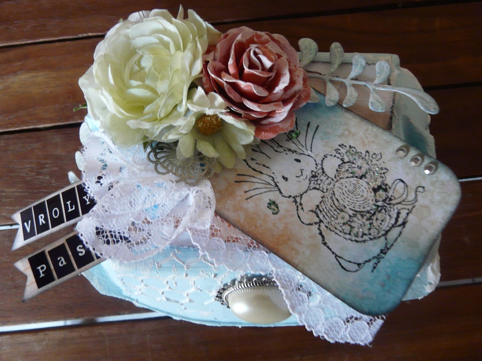 Het doosje schilderde ik lichtblauw en bewerkte het rondom met gesso. Op de bovenkant plakte ik twee laagjes papier van het mooie Offshore papier van Kaisercraft. Ik stempelde het konijntje op een tag die ik vooraf had bewerkt met distress inkt en water.