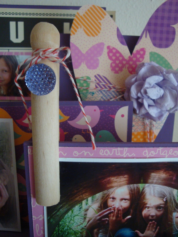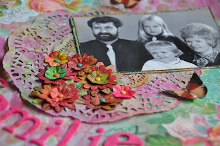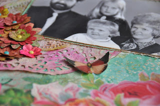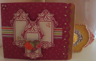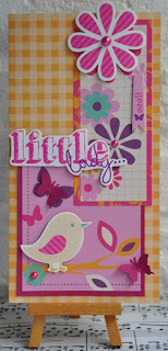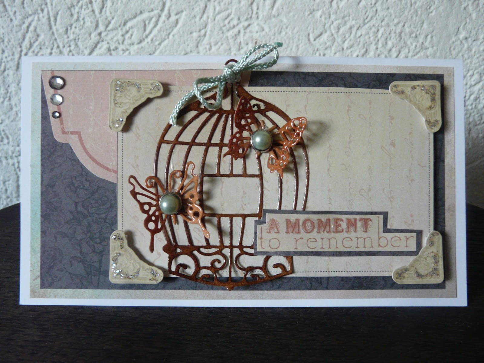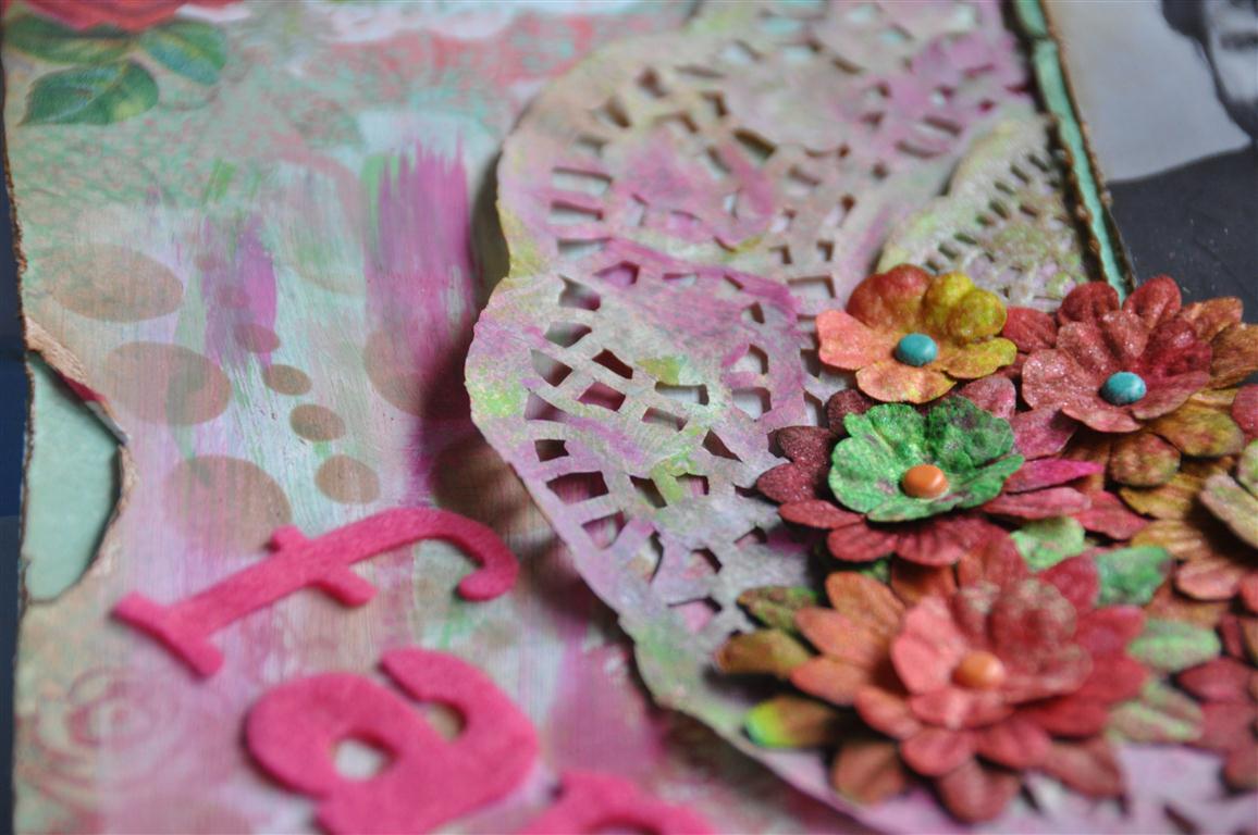 De oranje bloem maakte ik zelf met een stansmal, de kleine blauwe bloemetjes die er tussenuit piepen komen uit de webwinkel van Helena net als de blaadjes onder de bloemen. Wat kant en een parel maakten de buitenkant af.
