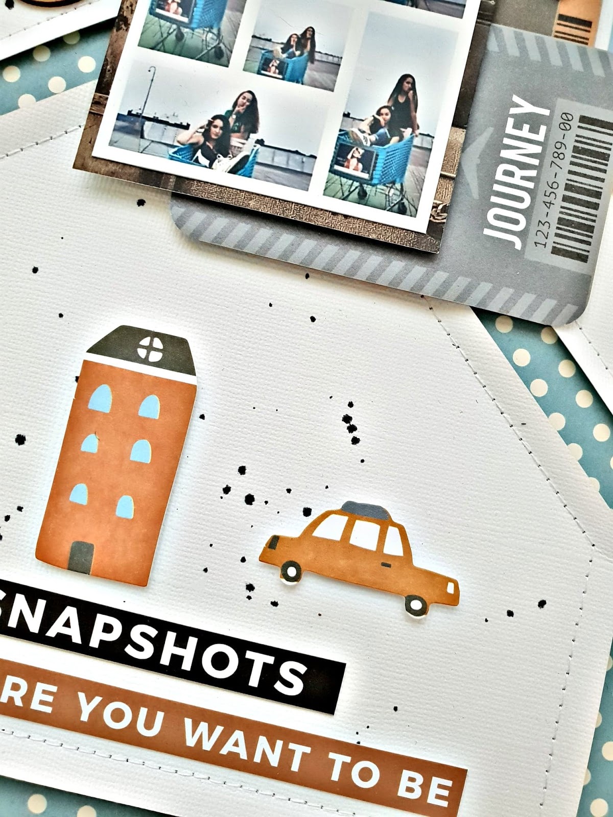 Voor de basis van mijn layout heb ik twee layers gebruikt, 1 dessin vel Carry on en wit Bazzill cardstock, het witte cardstock heb ik in drie stukken gesneden en via de naaimachine bevestigd op de 1ste layer. Ik heb gekozen voor 1 foto die bestaat uit kleine fototjes ook wel snapshots genoemd, de foto heb ik met een donker stukje dessin vel gemat waardoor de foto beter tot zijn recht komt.