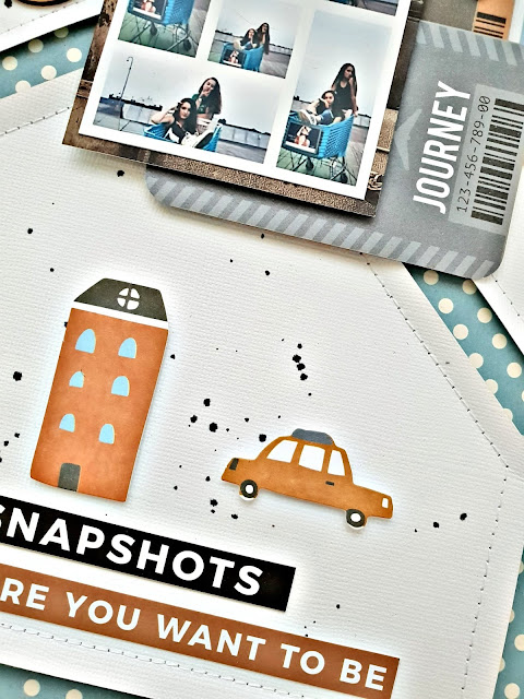 Om mijn design verder tot stand te brengen heb ik de foto extra benadrukt met 3 tags en verhoogd met chipboard, daarom heen tekst strips, inkt spetters, wood veneer en collectables uit dezelfde collectie.....