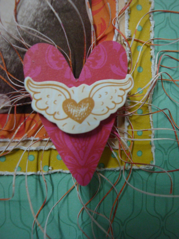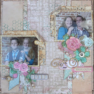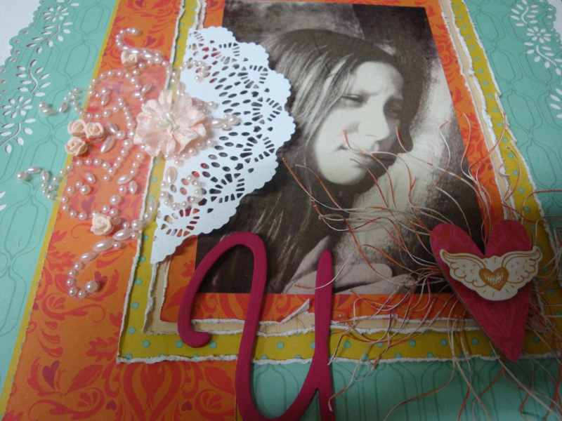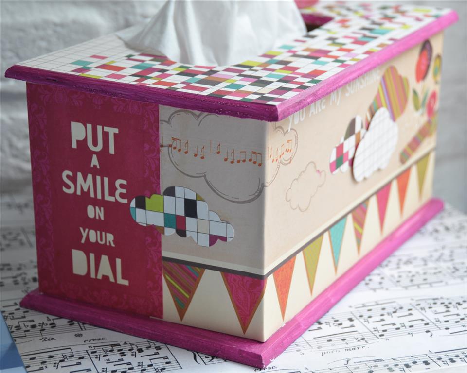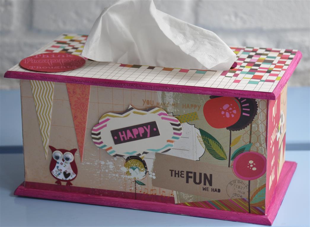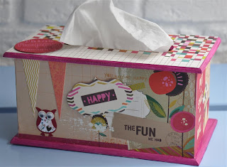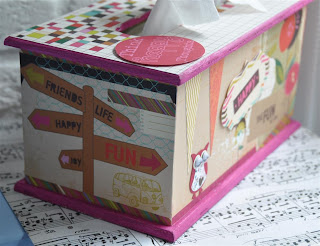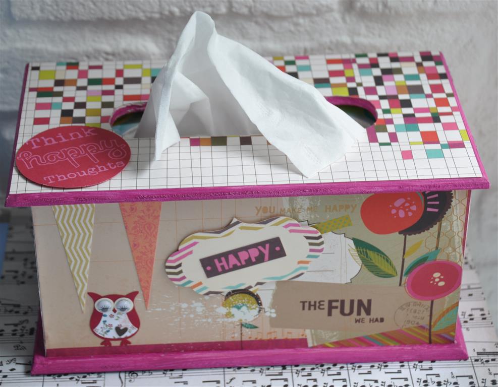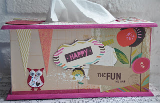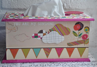 Het theedoosje heb ik eerst uit elkaar gehaald en bewerkt met gesso. Daarna de verschillende papiertjes op maat gesneden en erop geplakt. Met de mini doily van cheery linn 2 papiertjes gesneden en die met foam onder een knoop geplakt. Zo krijg je een grappig rozetje onder je knoop. Onder de knoop en door de knoopsgaten heb ik nog wat touw verwerkt en een bedeltje. De letters heb ik uit foam gesneden. Langs de onderrand heb ik een strookje washi tape geplakt voor de stevigheid. En ook hier komt er een stukje bloemenlint terug.