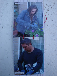 De 2 potjes zijn beplakt met een strook roze papier en daaroverheen een kantje. In de hals een wit lintje en een stoffen 'hoedje'. Met plaklettertjes heb ik suiker en melk op de potjes geplakt.