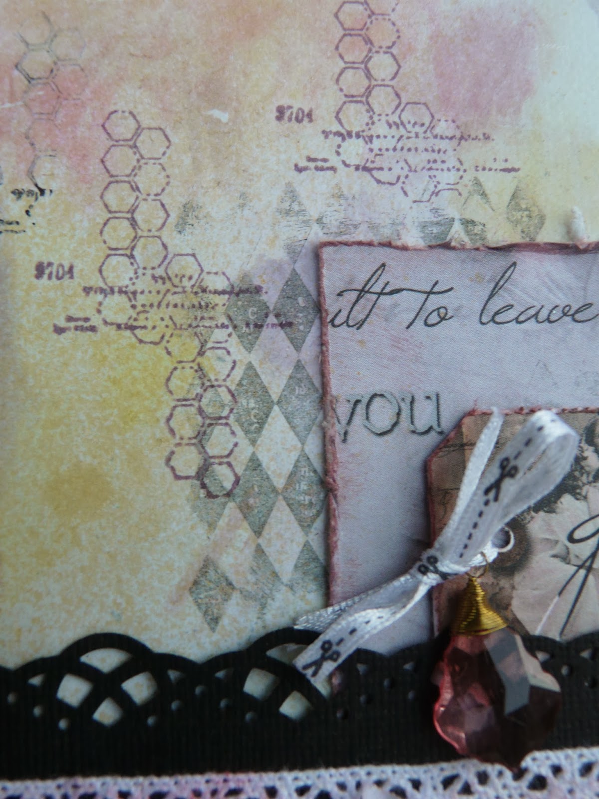 aangebracht. Hierna heeft Brigitta met modeling paste de swirls en het bloemenpatroon aan gebracht, het geen bestempeld en tevens weer een laag gesso aangebracht om de felle
