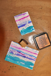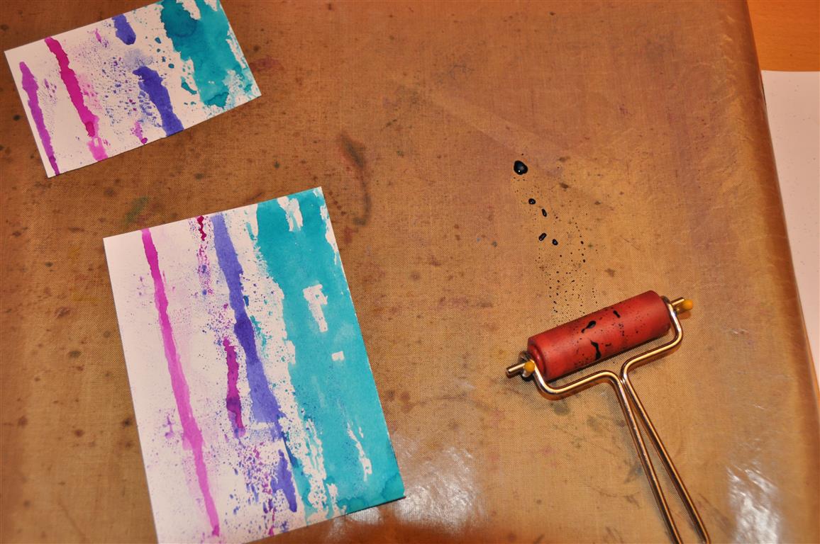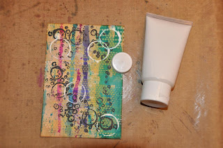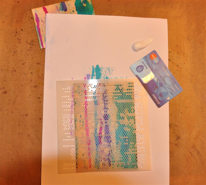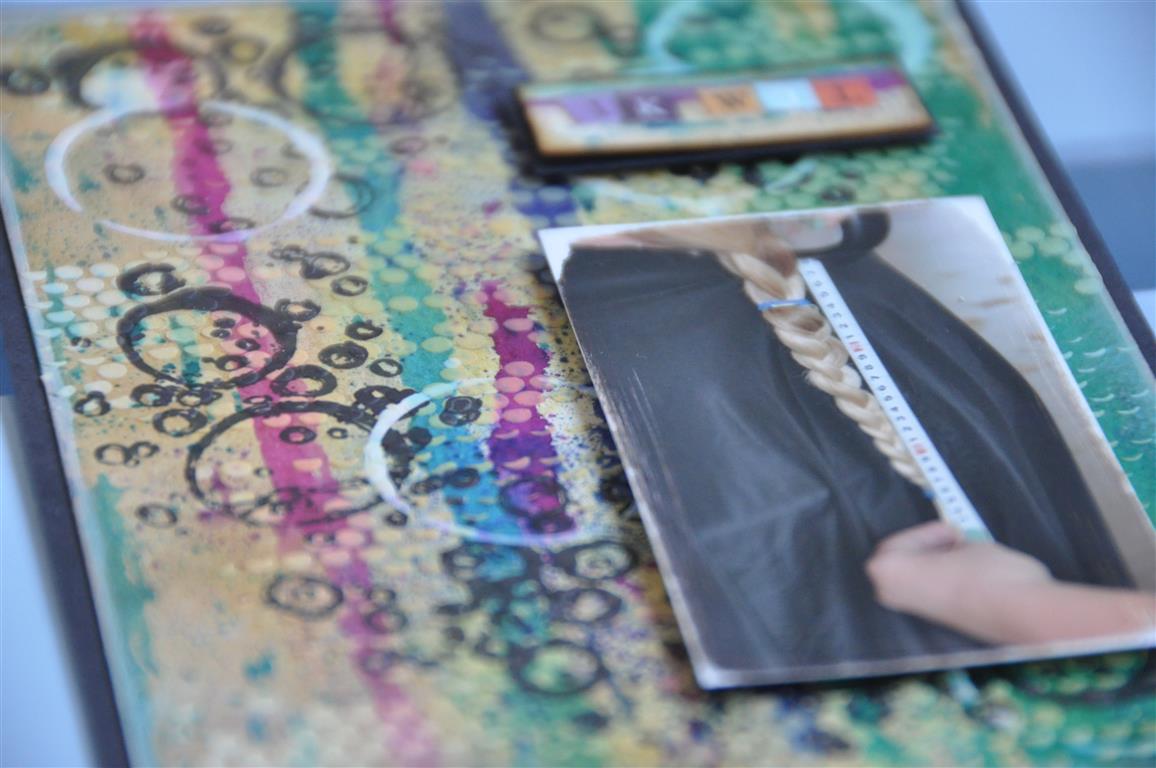 Ik heb het dienblad met roze acrylverf geschilderd en daarna een aantal stroken papier geplakt en daaroverheen een taartonderzetter. Het geheel heb ik met een medium gel ingesmeerd zodat het waterafstotend is, anders is het papier natuurlijk zo stuk. Als laatste heb ik het bloemetjeslint erop geplakt.