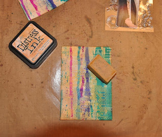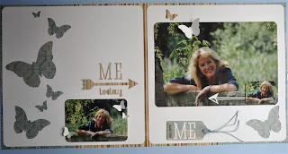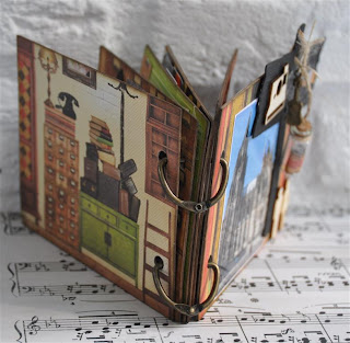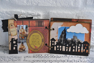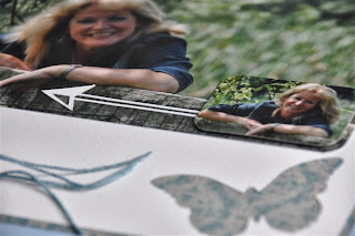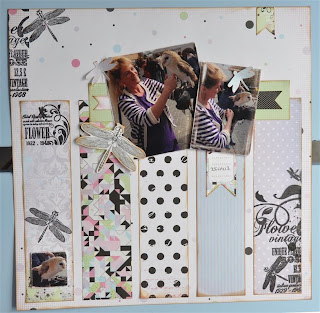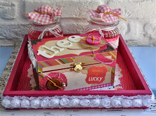 Het theedoosje heb ik eerst uit elkaar gehaald en bewerkt met gesso. Daarna de verschillende papiertjes op maat gesneden en erop geplakt. Met de mini doily van cheery linn 2 papiertjes gesneden en die met foam onder een knoop geplakt. Zo krijg je een grappig rozetje onder je knoop. Onder de knoop en door de knoopsgaten heb ik nog wat touw verwerkt en een bedeltje. De letters heb ik uit foam gesneden. Langs de onderrand heb ik een strookje washi tape geplakt voor de stevigheid. En ook hier komt er een stukje bloemenlint terug.