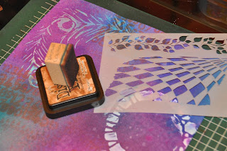 Met een template en bruine distress inkt ga ik wat effecten op mijn gekleurde papier aanbrengen.
