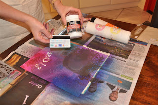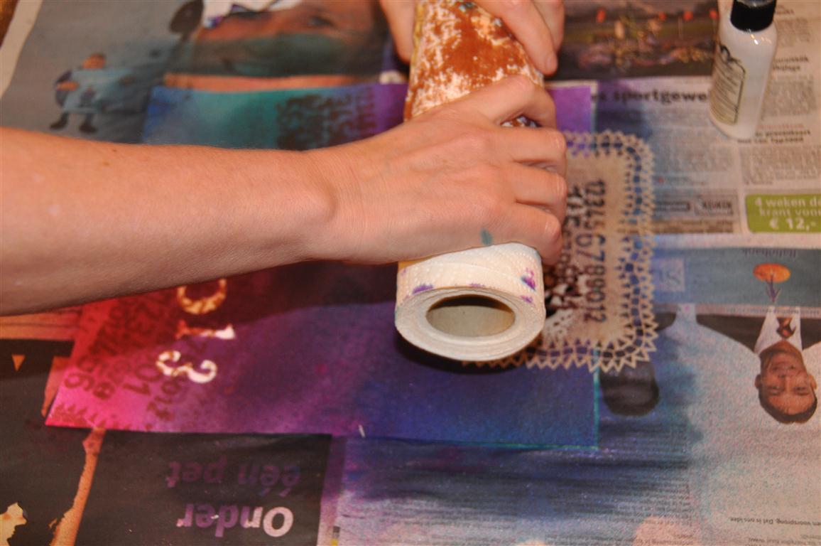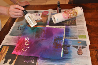 Je sprayt de verschillende kleuren op je papier en na elke ronde rol je er met je keukenpapier overheen om het te drogen.