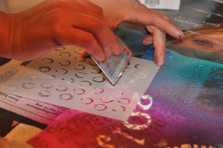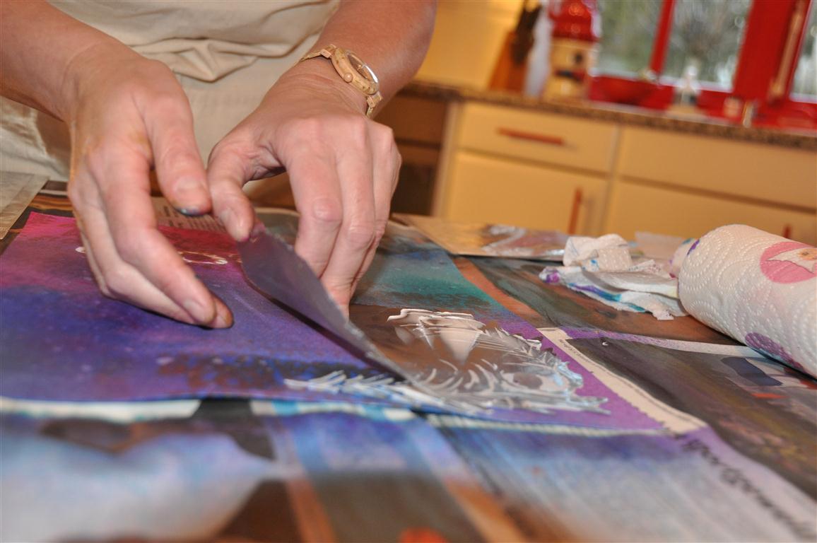 Nu een template met gesso. De gesso breng ik ook op met een oude bankpas, maar gesso is dunner en iets moeilijker te verwerken.