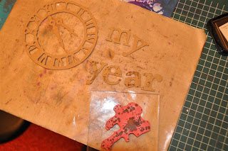 De klok van Tim Holtz heb ik uit dozenkarton gestanst en ook de letter voor 'my year'. Ik ga ze met een verfspat stempel en bruine stazon bestempelen.