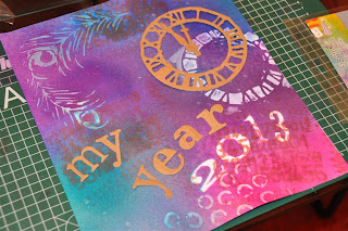Voor vandaag heb ik een foto tutorial gemaakt (met dank aan Esther voor het maken van de meeste foto's) over het werken met dylusions ink spray, glimmermist en templates. Ik ga aan de slag met het maken van een cover voor mijn eigen jaaroverzicht 2013.