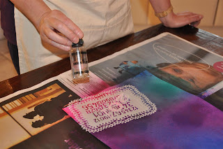 De volgende stap is om met water en een template te werken. Dylusisons ink spray reageert met water en laat dan een lichter effect (een soort watermerk) zien op je kleur. Glimmermist doet dit niet, dus wil je het effect van water zien, let er dan op dat je een stukje inkt pakt met dylusions.